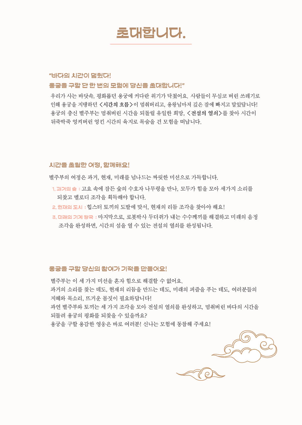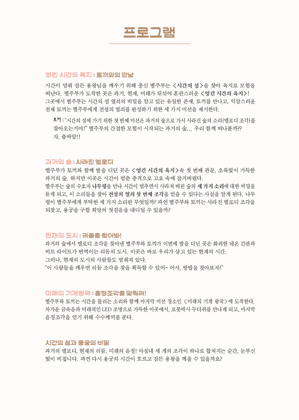 ABOUT PERFORMANCE 공연정보 상세보기 공 연 명 : 별주부와 시간의 섬 공연일시 : 2025년 12월 05일(금) 19:30 공연장소 : 우진문화공간 예술극장 런닝타임 : 50분 티켓금액 : 무료공연 할인정보 : 주최 : 전북특별자치도청 주관 : 국은예에트(etre) 공연문의 : 010-9057-9903 연령제한 : 전 연령 관람가능 예매하기