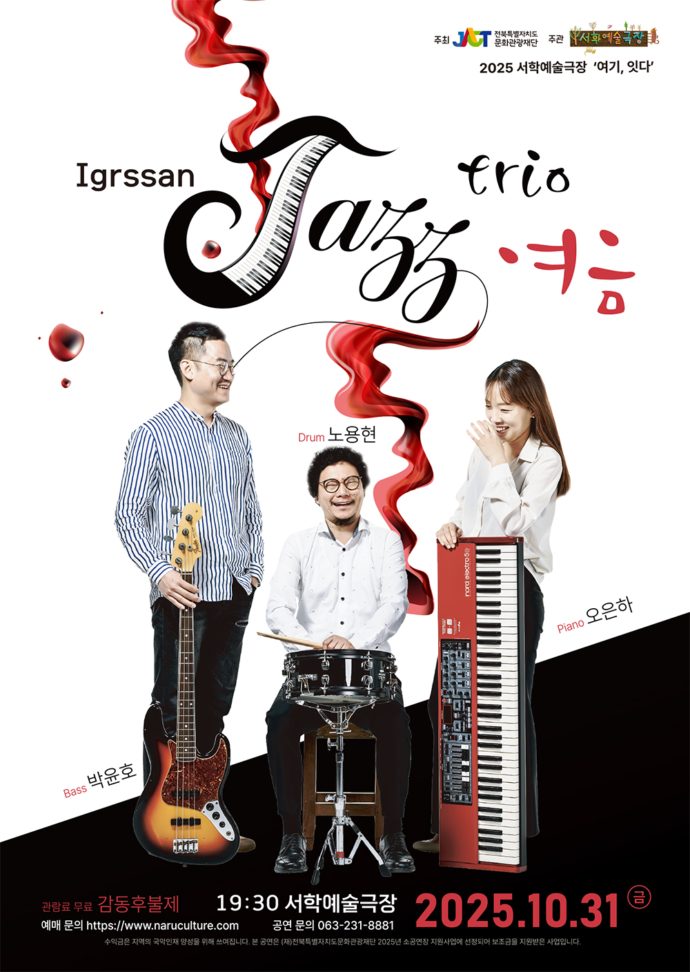 ABOUT PERFORMANCE 공연정보 상세보기 공 연 명 : 이그라산 재즈트리오 여음 공연일시 : 2025년 10월 31일(금) 19:30 공연장소 : 서학예술극장 런닝타임 : 60분 티켓금액 : 무료공연 할인정보 : 주최 : 전북특별자치도문화관광재단 주관 : 서학예술극장 공연문의 : 063-231-8881 연령제한 : 5세 이상 관람가능 예매하기