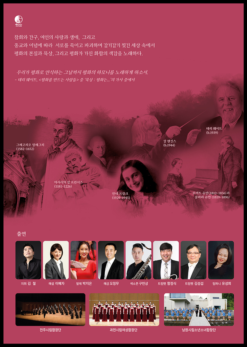 이번 공연에서는 과천시립여성합창단이 함께하며 특히 이혜자 님(군산대 명예교수, 독일문학)의 해설과 무용수 박지은 님(국립무용단)의 독무를 콜라보하여 관객들에게 더욱 깊은 감동을 선사하고자 합니다.