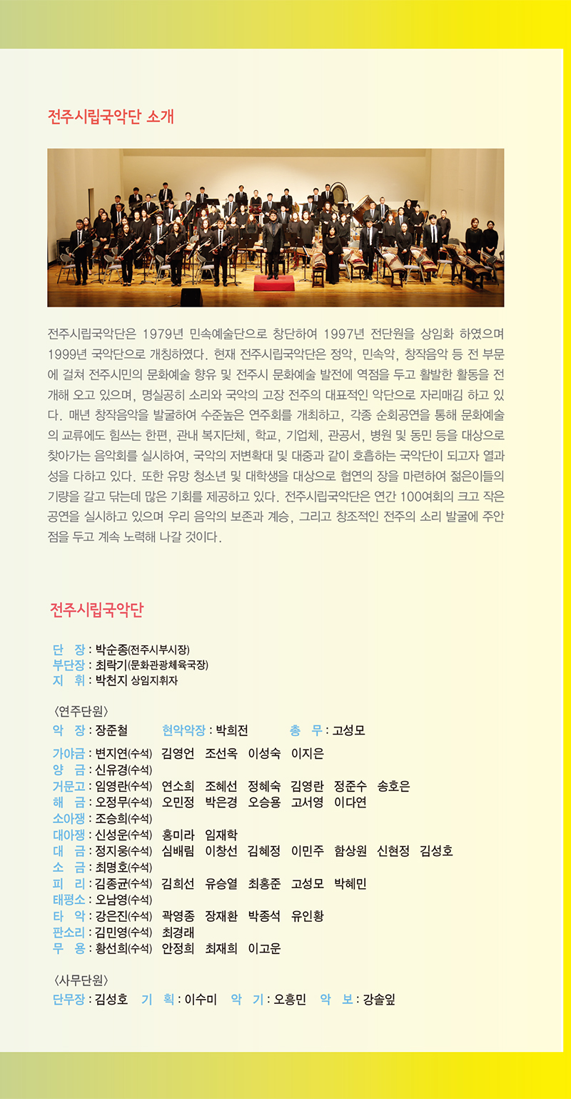 ABOUT PERFORMANCE 공연정보 상세보기 공 연 명 : 전주시립국악단 상설공연 - 남상일과 함께하는 정오의 비타민 콘서트 공연일시 : 2017.09.12/10.17/11.14 (화) 오전 11:00 공연장소 : 덕진예술회관 런닝타임 : 티켓금액 : 무료공연 할인정보 : 주최 : 전주시 주관 : 전주시립국악단 공연문의 : 063-281-2766 연령제한 : 본 공연은 만8세이상 관람이 가능합니다 전주 시민을 위한 무료공연입니다