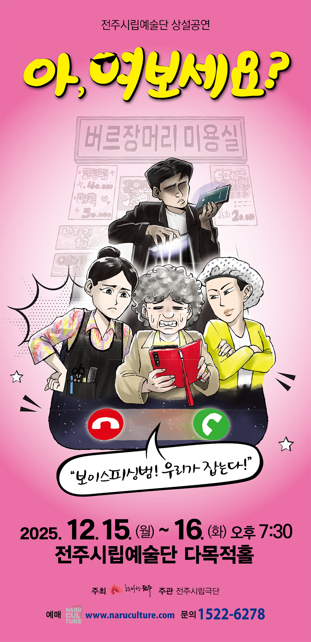 ABOUT PERFORMANCE 공연정보 상세보기 공 연 명 : 2025전주시립예술단 상설공연(시립극단) 공연일시 : 2025년 12월 15일(월)~16일(화) 19:30 공연장소 : 전주시립예술단 다목적홀 런닝타임 : 50분 티켓금액 : 무료공연 할인정보 : 주최 : 전주시 주관 : 전주시립예술단 공연문의 : 063-275-1044 연령제한 : 8세 이상 관람 가능 예매하기 2025전주시립예술단 상설공연 중 시립극단 공연입니다