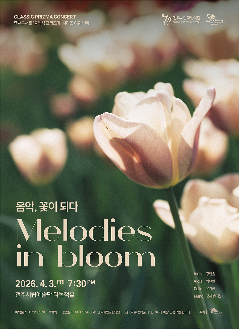 ABOUT PERFORMANCE 공연정보 상세보기 공 연 명 : 음악, 꽃이 되다 Melodies in bloom 공연일시 : 2026년 04월 03일(금) 19:30 공연장소 : 전주시립예술단 다목적홀 런닝타임 : 80분 티켓금액 : 무료공연 할인정보 : 주최 : 전주시 주관 : 전주시립교향악단 공연문의 : 063-274-8641 연령제한 : 8세 이상 관람 가능 예매하기 1인 2매만 구매가능