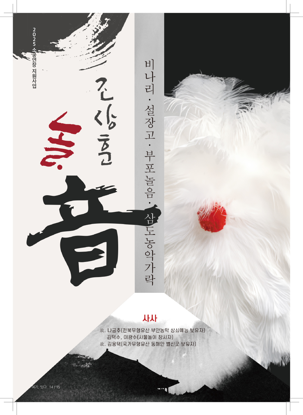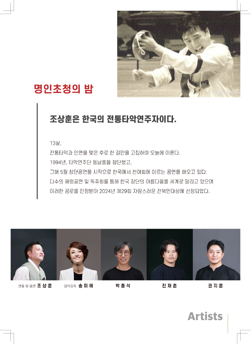 ABOUT PERFORMANCE 공연정보 상세보기 공 연 명 : 조상훈 놀.음(音) 공연일시 : 2025년 09월 26일(금) 19:30 공연장소 : 서학예술극장 런닝타임 : 60분 티켓금액 : 무료공연 할인정보 : 주최 : 전북특별자치도문화관광재단 주관 : 서학예술극장 공연문의 : 063-231-8881 연령제한 : 5세 이상 관람가능