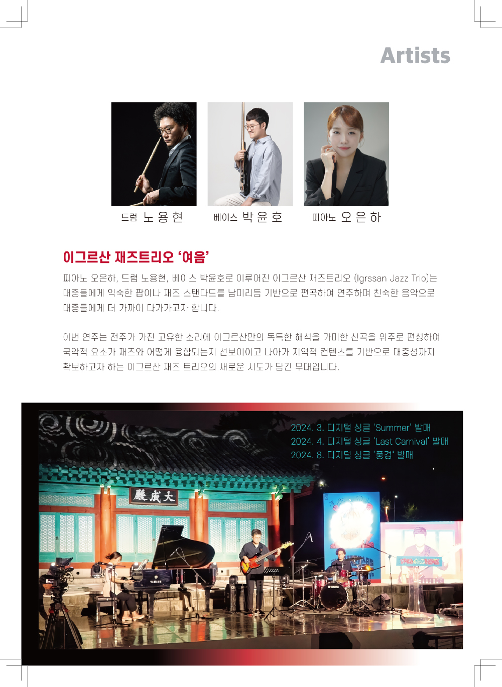 ABOUT PERFORMANCE 공연정보 상세보기 공 연 명 : 이그라산 재즈트리오 여음 공연일시 : 2025년 10월 31일(금) 19:30 공연장소 : 서학예술극장 런닝타임 : 60분 티켓금액 : 무료공연 할인정보 : 주최 : 전북특별자치도문화관광재단 주관 : 서학예술극장 공연문의 : 063-231-8881 연령제한 : 5세 이상 관람가능 예매하기